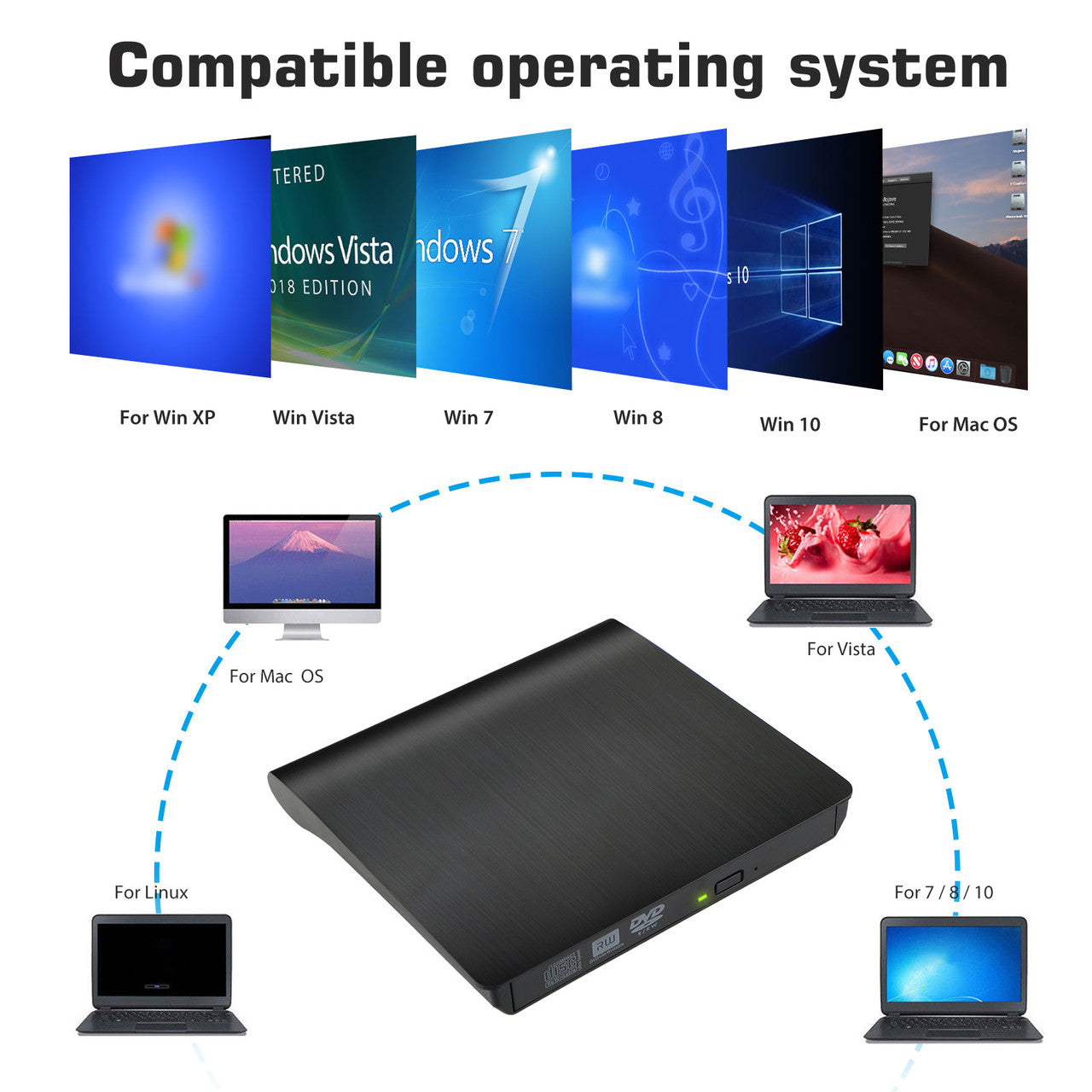 ✅Wide Compatibility: External CD/DVD drive for laptop PC desktop Linux OS Apple Mac MacBook Pro. cd burner DVD player compatible with Windows 10 /8.1/7/XP/Vista, Linux, all versions of Mac OS. Ideal for APPLE / DELL / SONY / SAMSUNG / ASUS / ACER / HP and other brands notebook, Ultrabook, PC, desktop that without drive hardware.