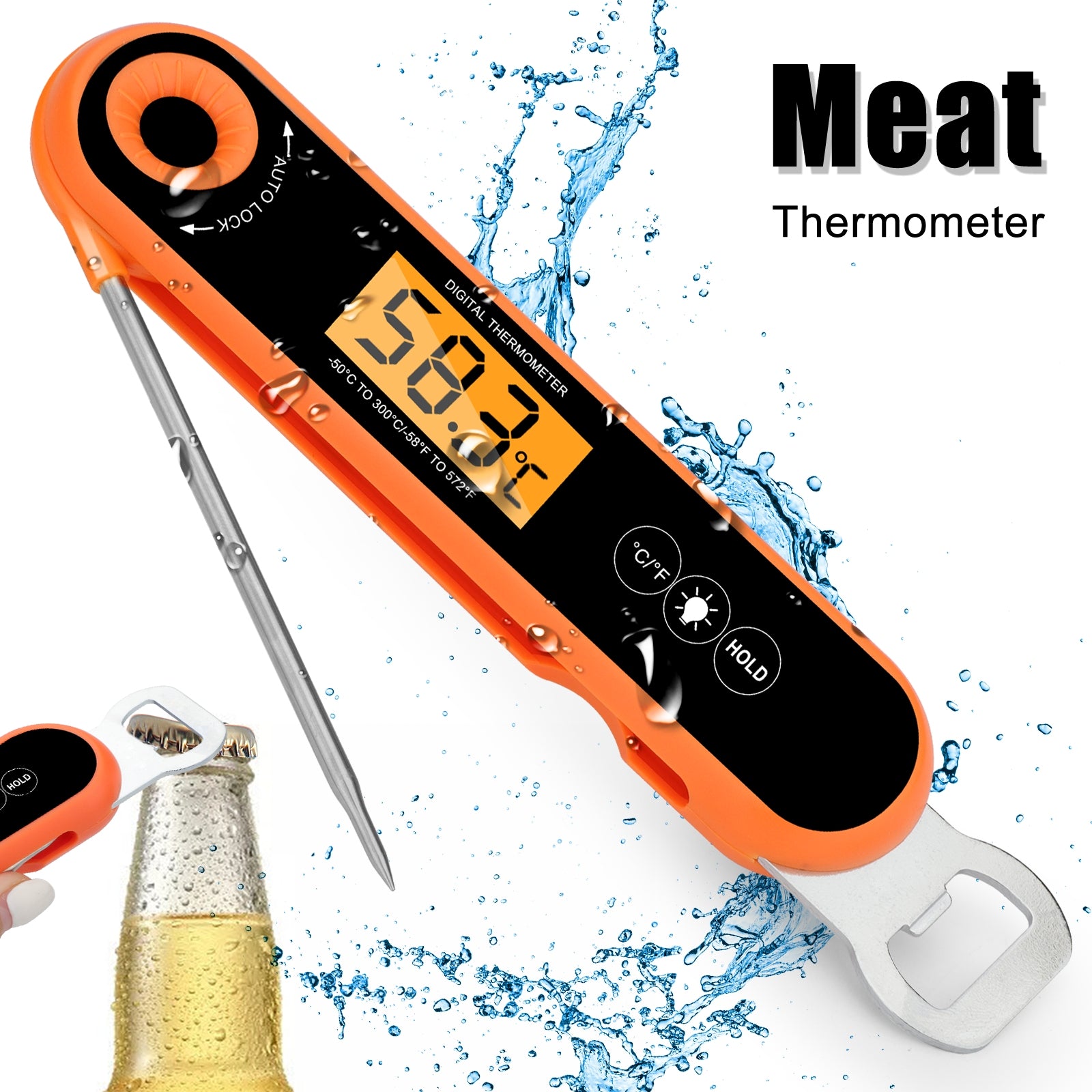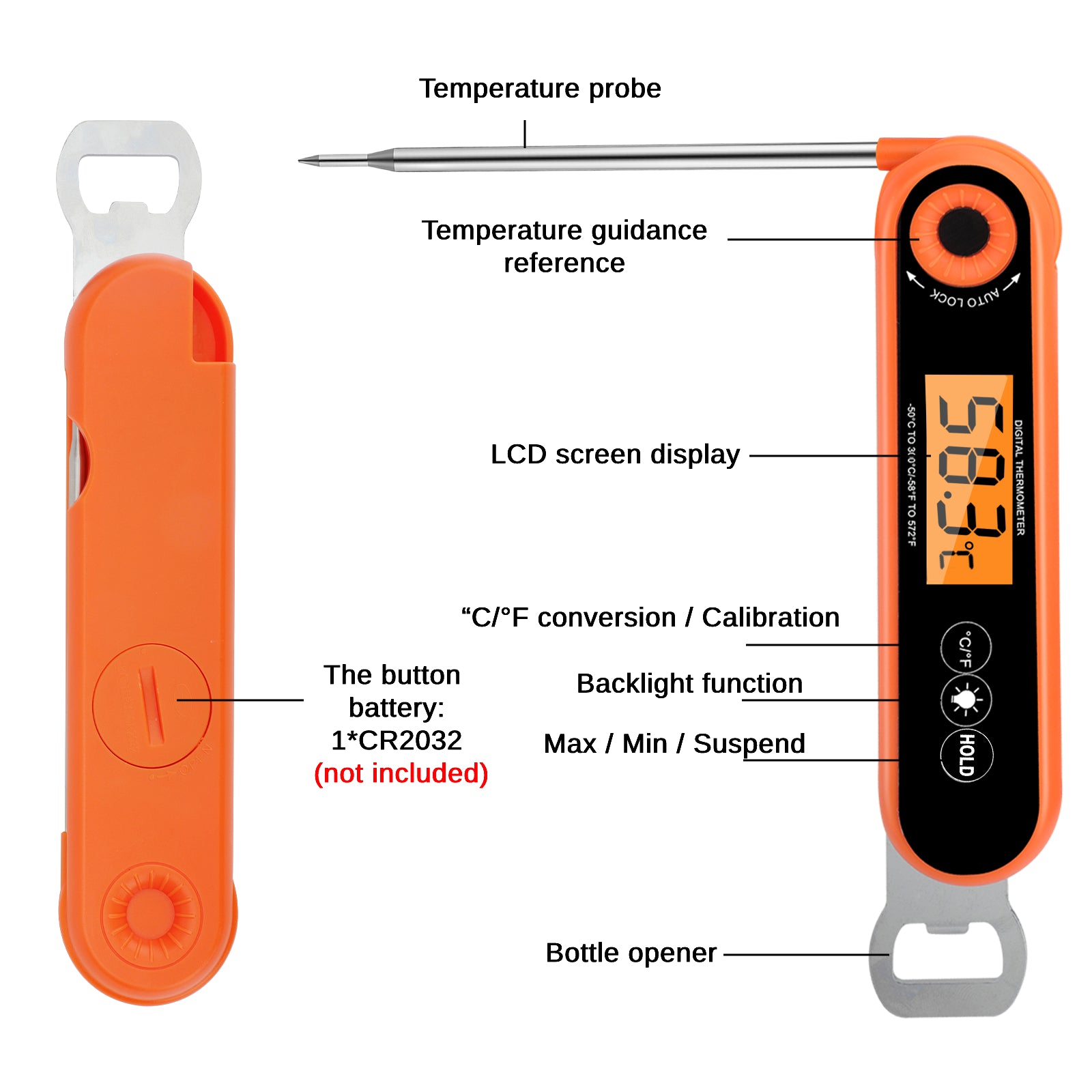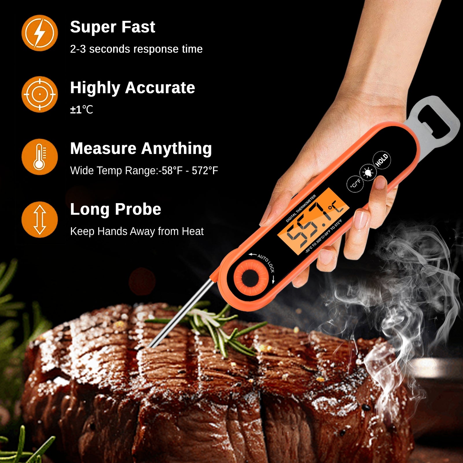 Instant Read Digital Food Thermometer - Foldable Food-Grade Stainless Steel Probe with Bottle Opener for Kitchen, BBQ, Grill (Orange /Black)