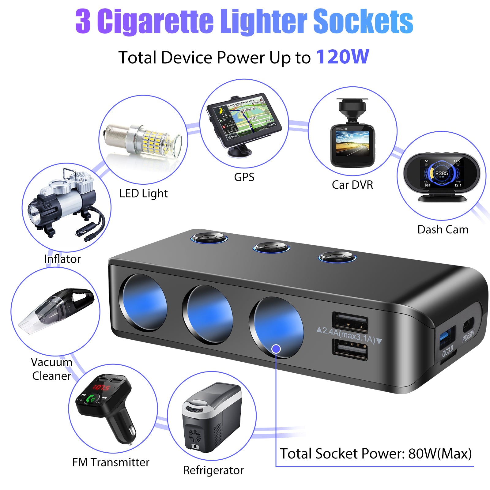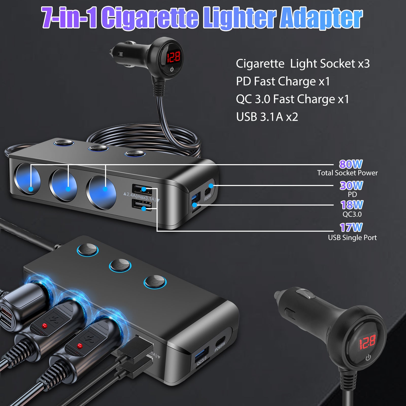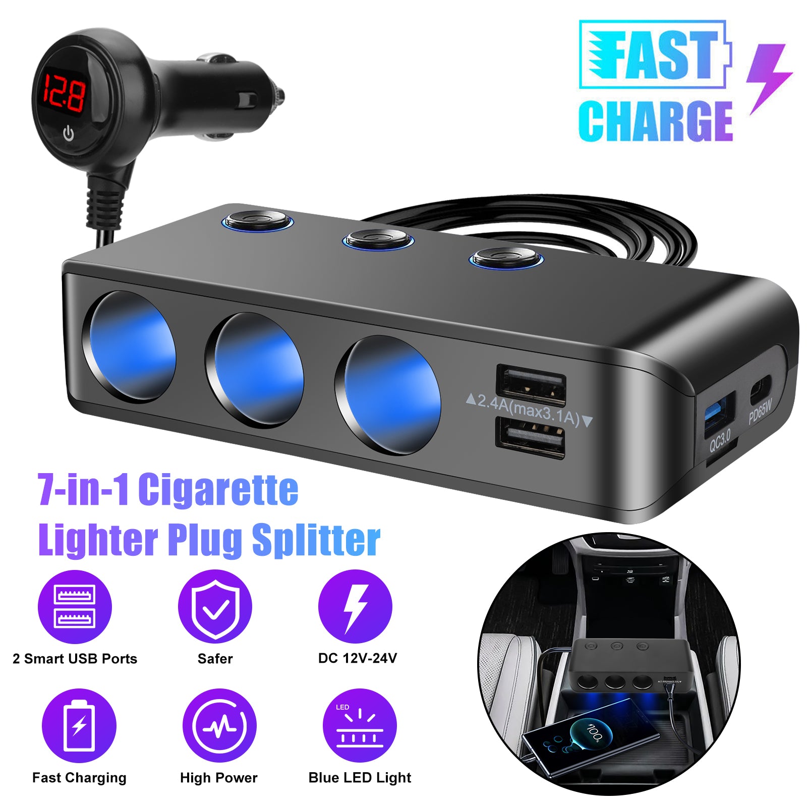 7-in-1 3 Way Cigarette Lighter Socket Splitter Power Adapter - LED Display Voltage 120W 12V/24V 3 USB +PD Car Charger Outlet for GPS Dash Cam Phone (Black)