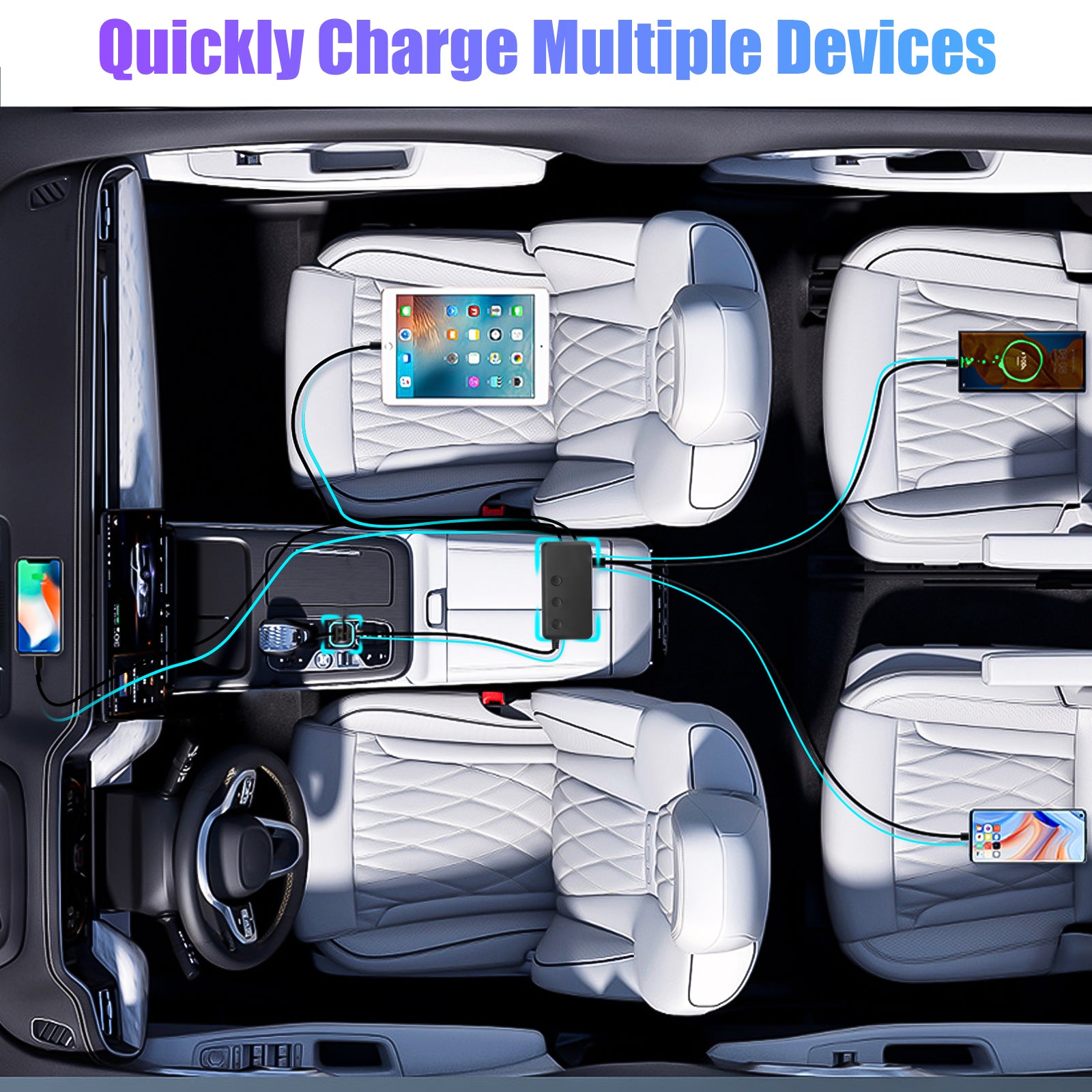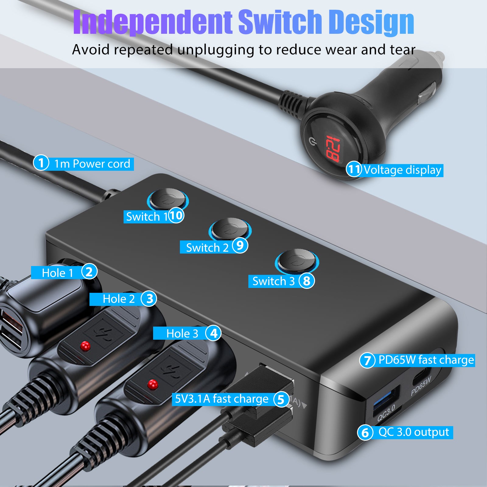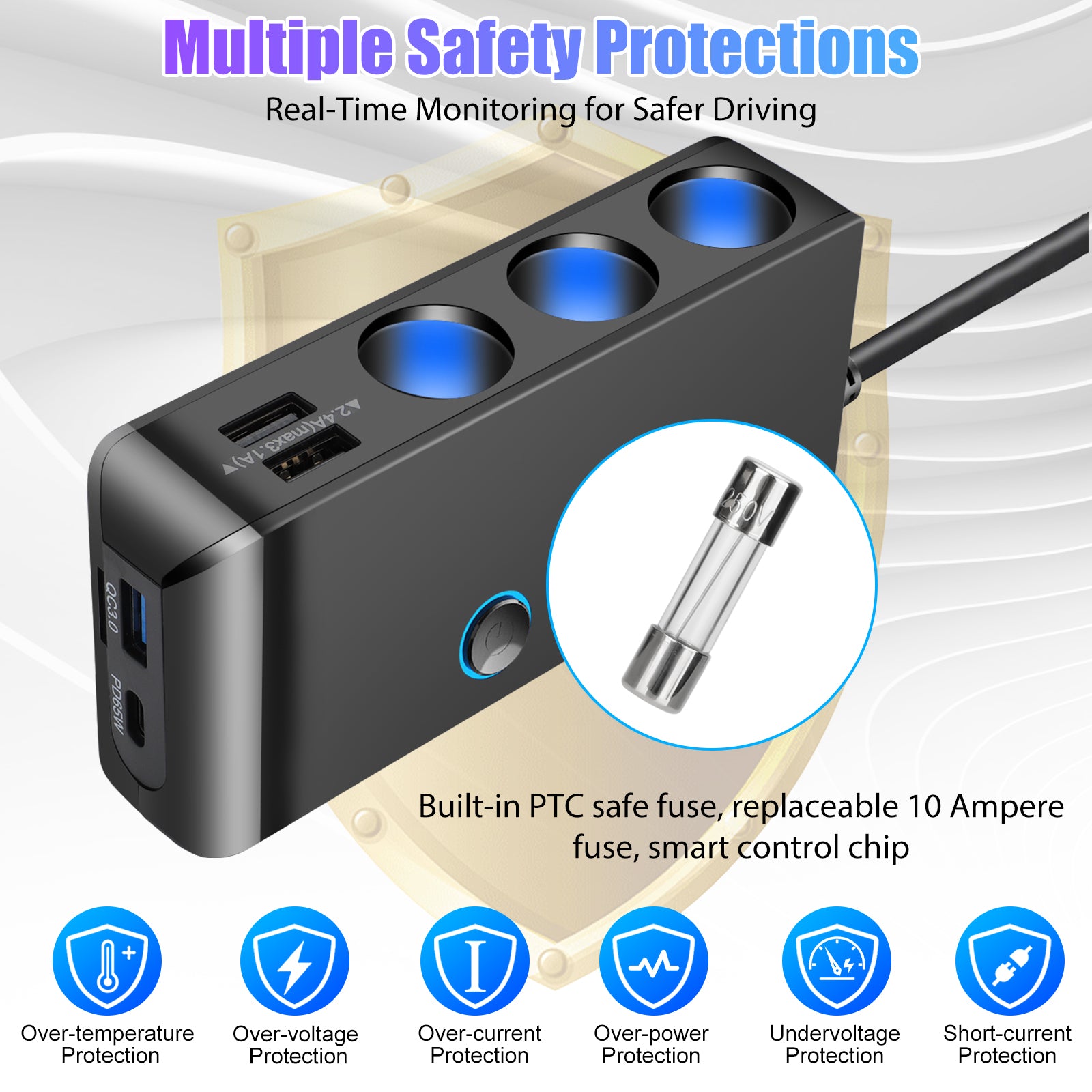 7-in-1 3 Way Cigarette Lighter Socket Splitter Power Adapter - LED Display Voltage 120W 12V/24V 3 USB +PD Car Charger Outlet for GPS Dash Cam Phone (Black)