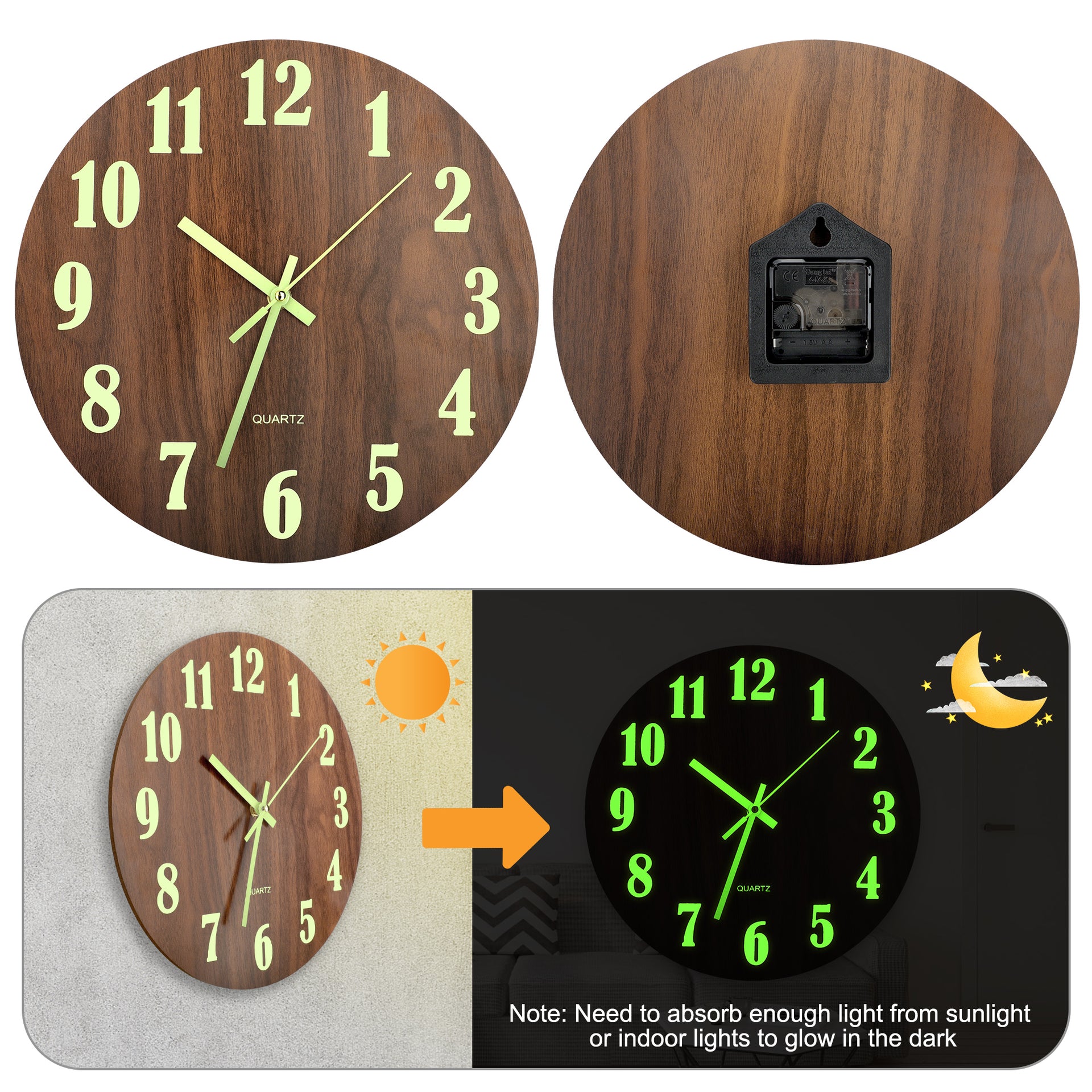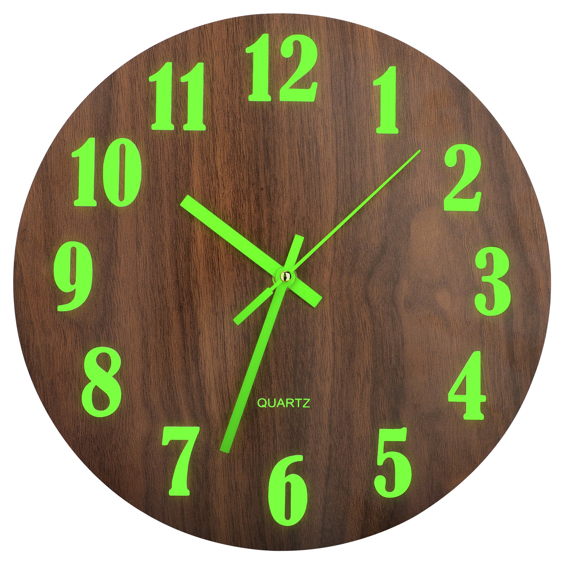 12-inch luminous wood grain round wall clock. Specially designed to be visible day and night, this decorative wall clock features an environmentally friendly luminous storage that charges with light energy throughout the day, ensuring a bright and long-lasting glow when darkness falls.