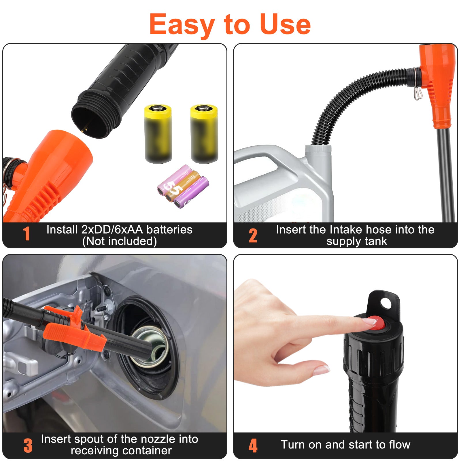 Portable Electric Pump: Ideal for on-the-go fuel transfers, this battery-powered pump is perfect for DIY mechanics and outdoor enthusiasts to effortlessly manage their fuel needs. Battery-Powered Convenience: Operates with 2 D Cell batteries or 6 AA batteries (not included), making it perfect for outdoor activities and emergencies.