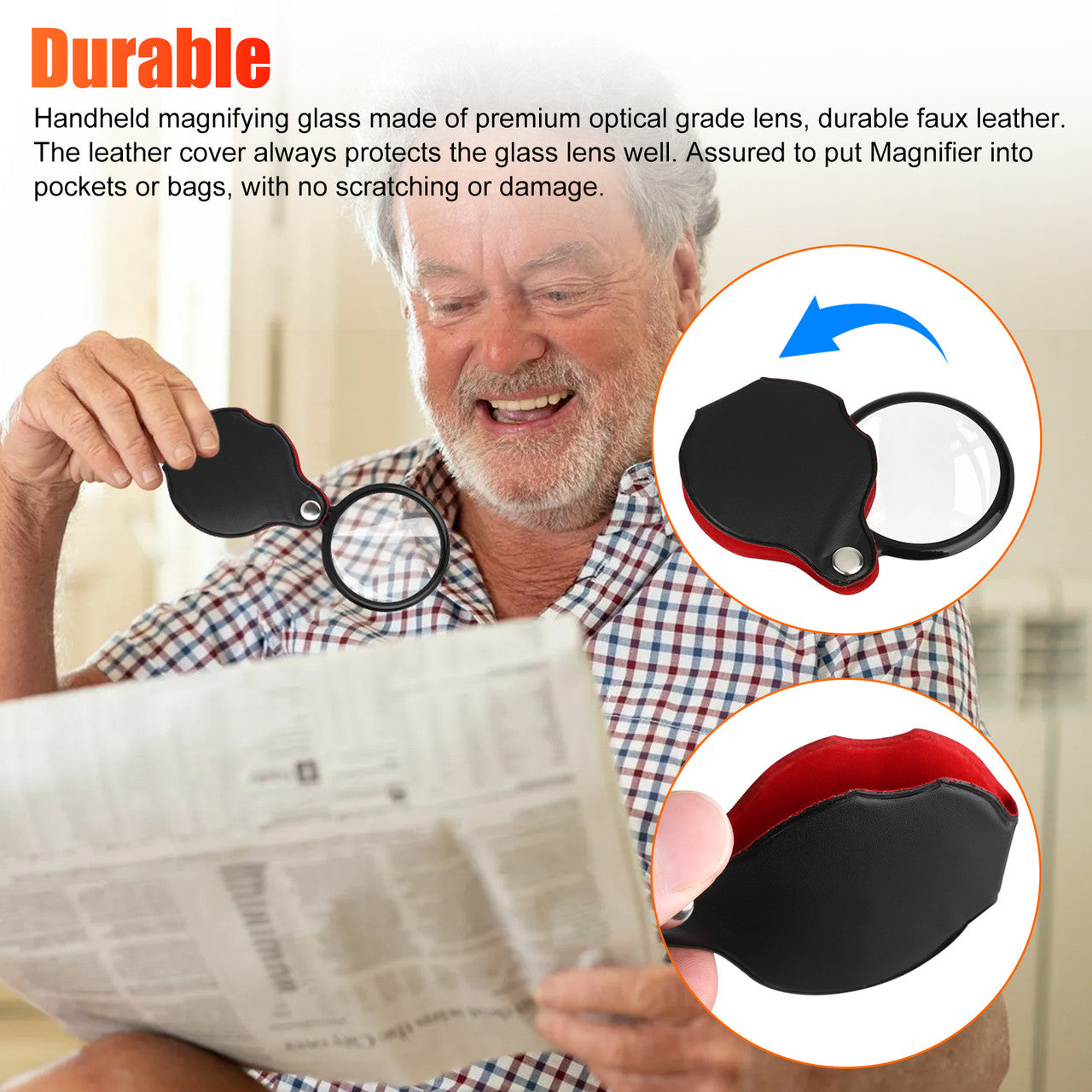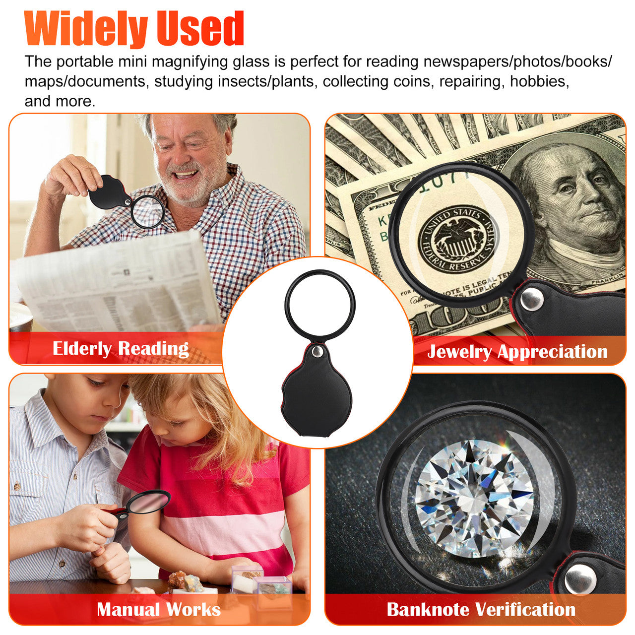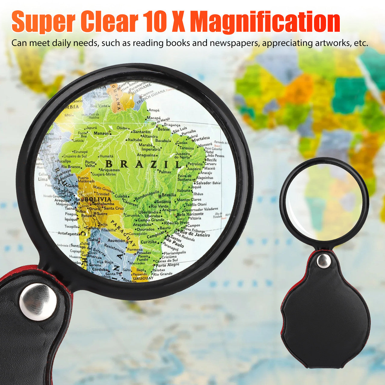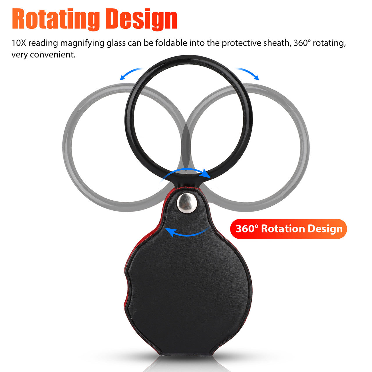 Product Features:● Durable: Handheld magnifying glass made of premium optical grade lens, durable faux leather. The leather cover always protects the glass lens well. Assured to put Magnifier into pockets or bags, with no scratching or damage. ● Rotating Design: 10X reading magnifying glass can be foldable into the protective sheath, 360° rotating, very convenient. ● Palm-Sized: Mini compact, palm-sized, easy to put into a pocket and carry with you anywhere. ● Widely Used: The portable mini magnifying glass is perfect for reading newspapers/photos/books/maps/documents, studying insects/plants, collecting coins, repairing, hobbies, and more.